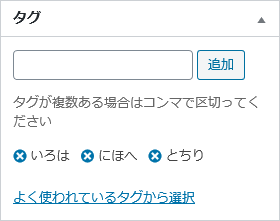 複数ある場合はコンマで区切るそうなので、適当に[いろは][にほへ][とちり]を入力する。「追加」ボタンを押すと、直下に追加される。