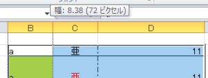 つまり、単位を入力しない場合、pxとして認識する様子。念のため、再度EXCELを確認すると、 幅:8.38(72ピクセル) との表示。